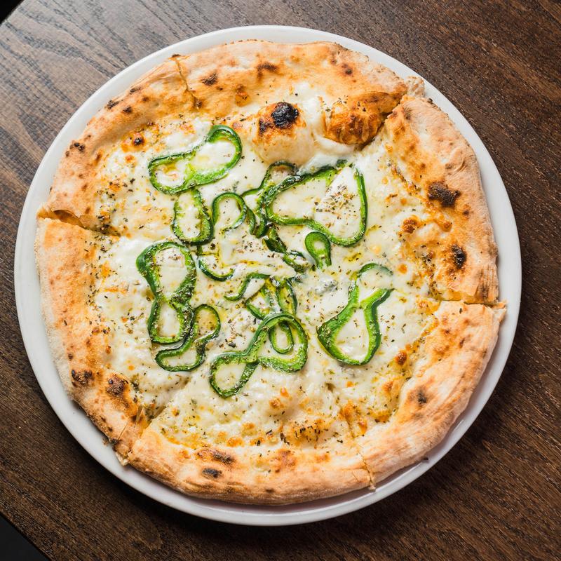 Gorgonzola, parmesan, fresh, & grated mozzarella cheeses, poblano peppers, EVOO.