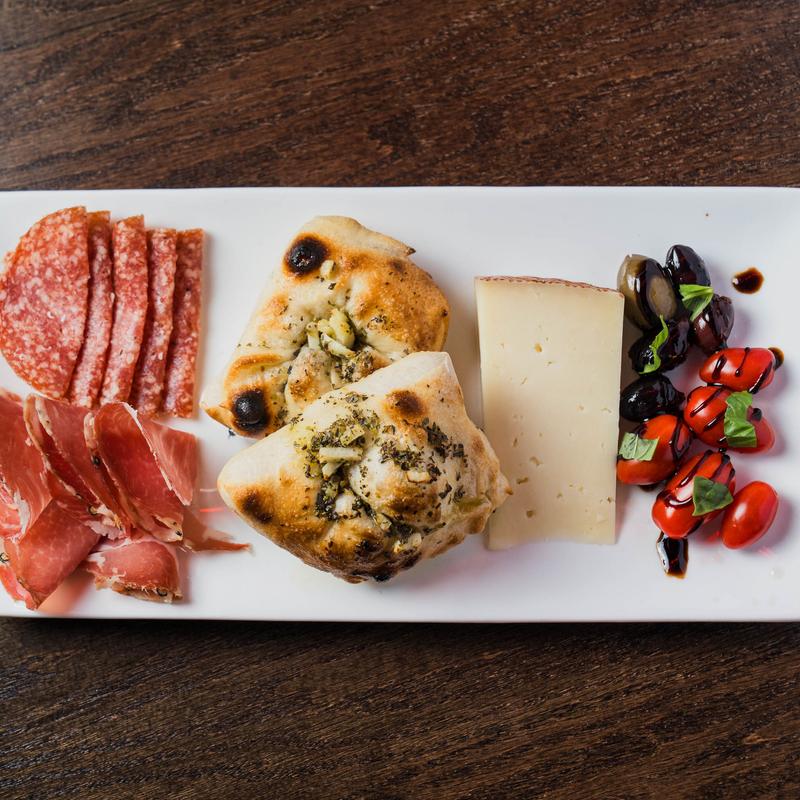 Manchego cheese, gypsy salami, coppa, olives, tomatoes, garlic bread.