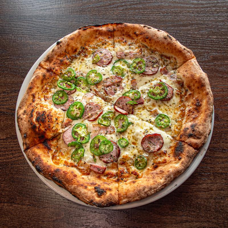 Sausage, smoked bacon, fresh jalapeño, fresh & grated mozzarella.