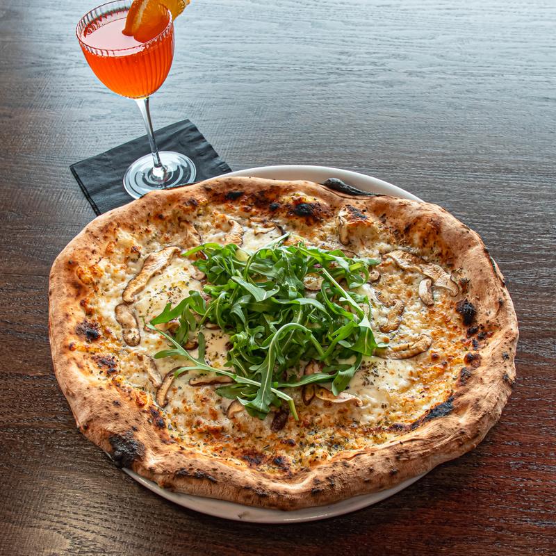 Truffle and artichoke pesto, mushrooms, arugula, fresh & grated mozzarella, EVOO.