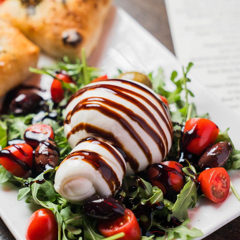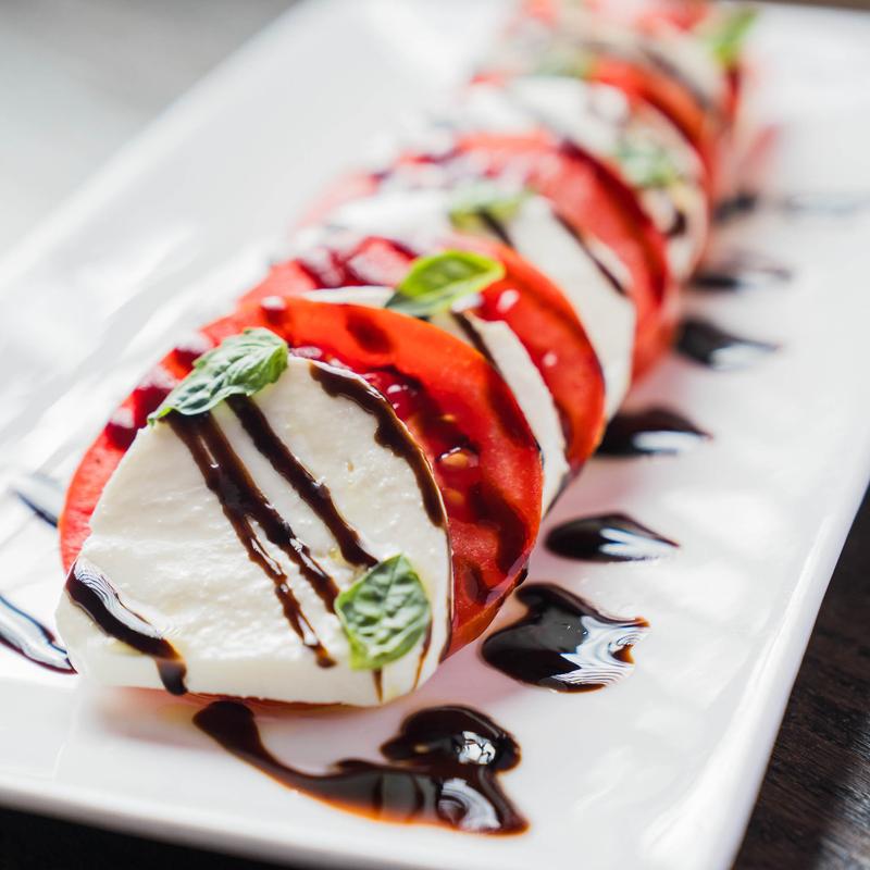 Fresh mozzarella, tomatoes, and basil, balsamic vinegar glaze, EVOO.