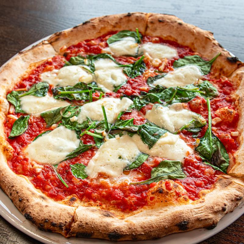 Fresh spinach, fresh mozzarella, garlic, tomato sauce, EVOO.