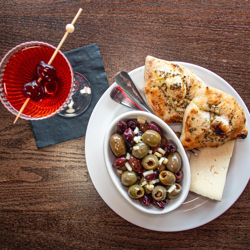 Marinated olives, Manchego cheese, garlic bread.