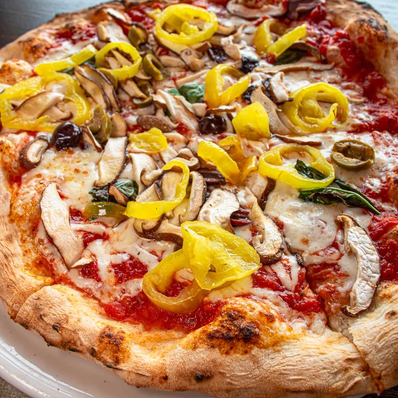 Grated mozzarella, mushrooms, olives, banana peppers, basil, tomato sauce, EVOO.